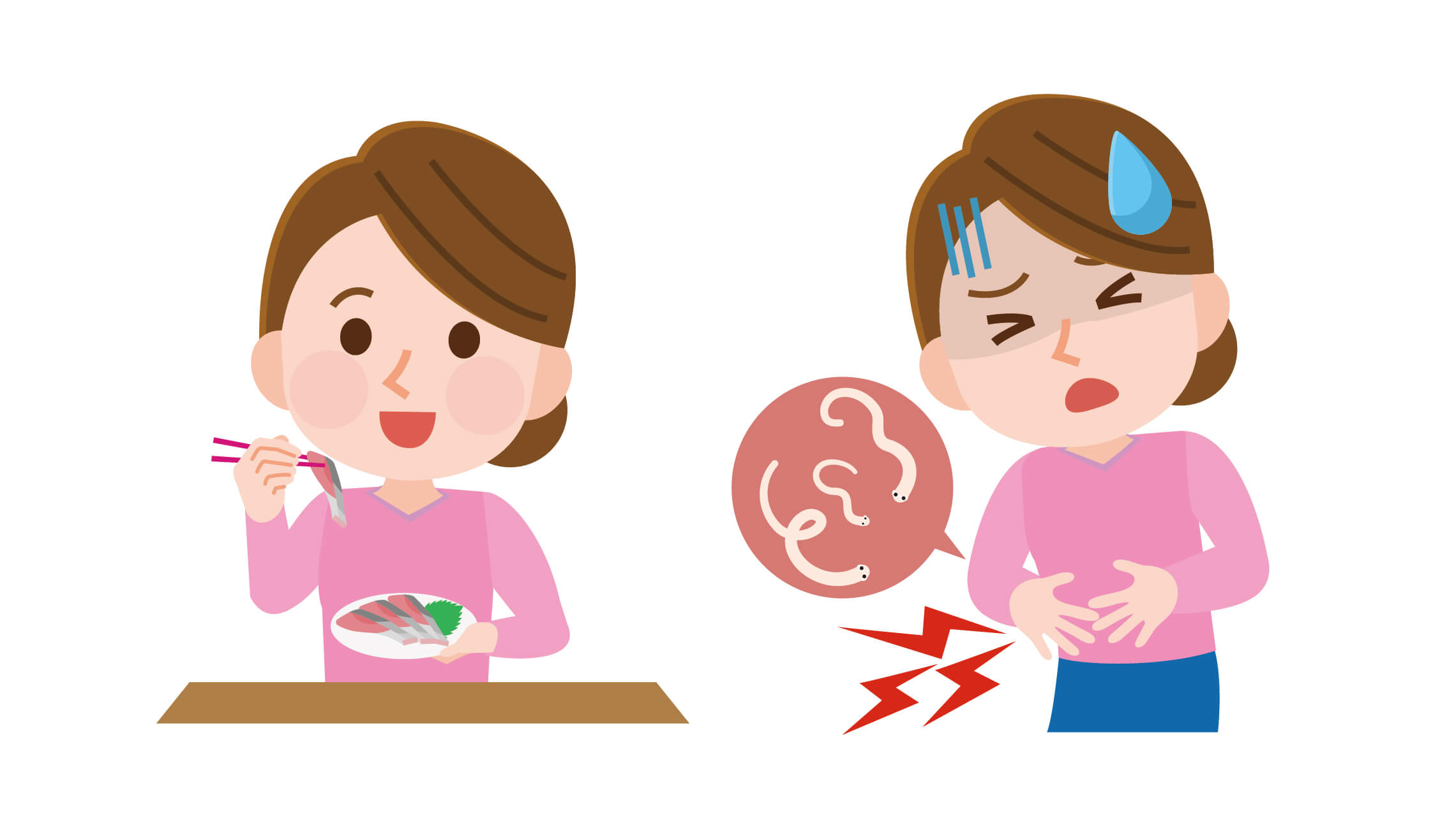 腸壁に刺入する急性腸アニサキス症は、食後十数時間から数日後に激しい下腹部痛などを生じます。その他、胃壁等に刺入しない場合でも、アニサキスがアレルゲンとなる蕁麻疹やアナフラキシーなどのアレルギー症状を示す場合があります。残念ながら、アニサキス幼虫に対する効果的な治療薬はなく、胃アニサキス症は胃内視鏡検査時に虫体を摘出します。腸アニサキス症の場合は痛みなどを抑える対症療法が中心に行われます。ヒトの体の中では、幼虫は通常1週間程度で死んで吸収されると言われています。