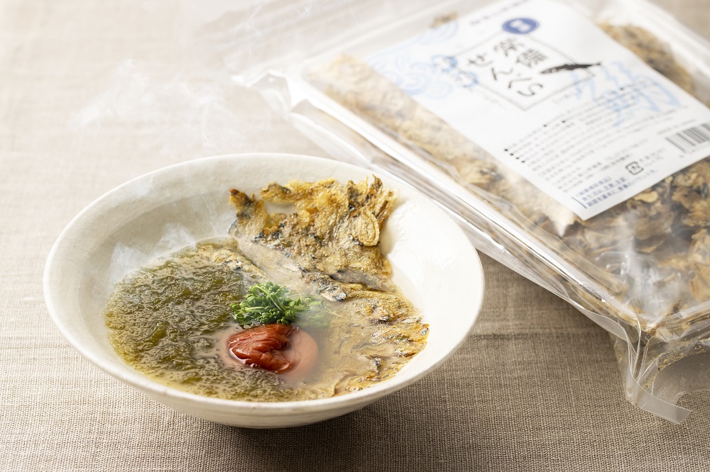 常備せんべい(いわし)を使った「とろろ昆布の吸い物」