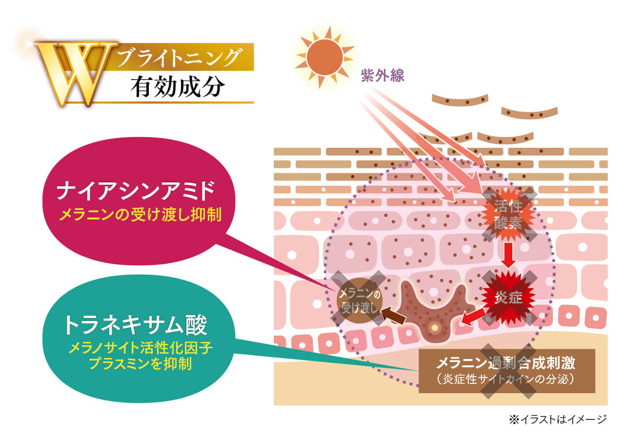 「ナイアシンアミド」がしみの元となるメラニンの受け渡しを抑制し、「トラネキサム酸」がしみの元をつくるメラノサイト活性化因子を抑制します。Wの有効成分がそれぞれ異なるステップにはたらきかけ、Wでしみ・そばかすを防ぎます※。さらに「ナイアシンアミド」が真皮にはたらきかけ、コラーゲンの産生を促して、肌の奥から押し上げるようにしわを改善します。