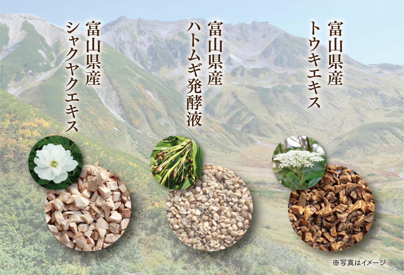 富山県産の「シャクヤクエキス」「トウキエキス」「ハトムギ発酵液」の3種の保湿成分を配合し、お肌のにハリとつやを与え、整えます。この3種の和漢植物エキスと、2つの有効成分の組み合わせは、「日本で唯一※」です!