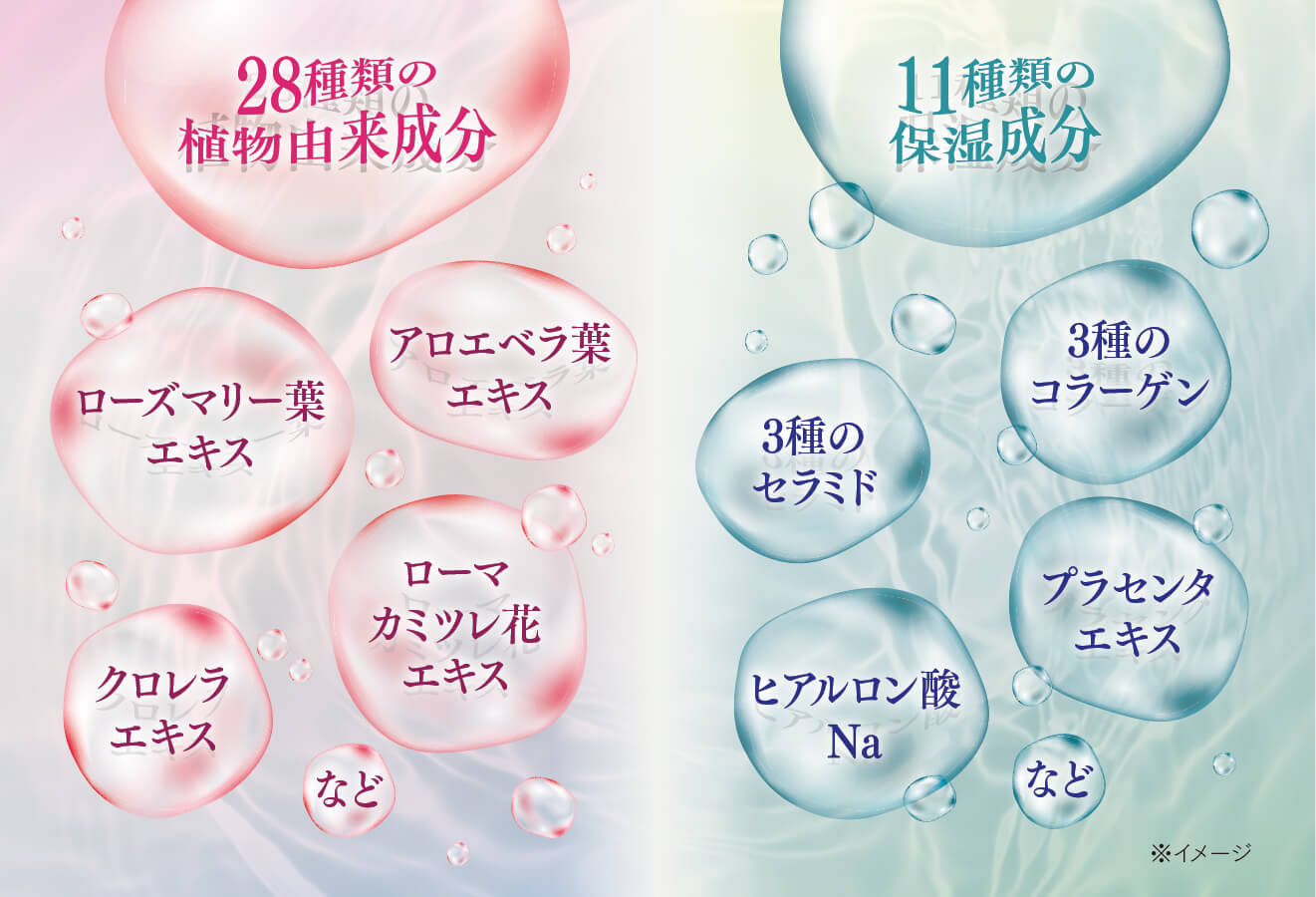 28種類の植物由来保湿成分と、11種類の保湿成分のあわせて39種類の保湿成分を配合。たっぷりと配合した保湿成分が、肌にハリとうるおいをもたらします。