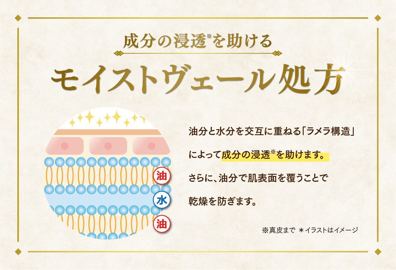 濃厚なクリームですが、油分と水分を交互に重ねる「ラメラ構造」によって成分の浸透を助け、肌にスーッとなじむのにべたつきません。