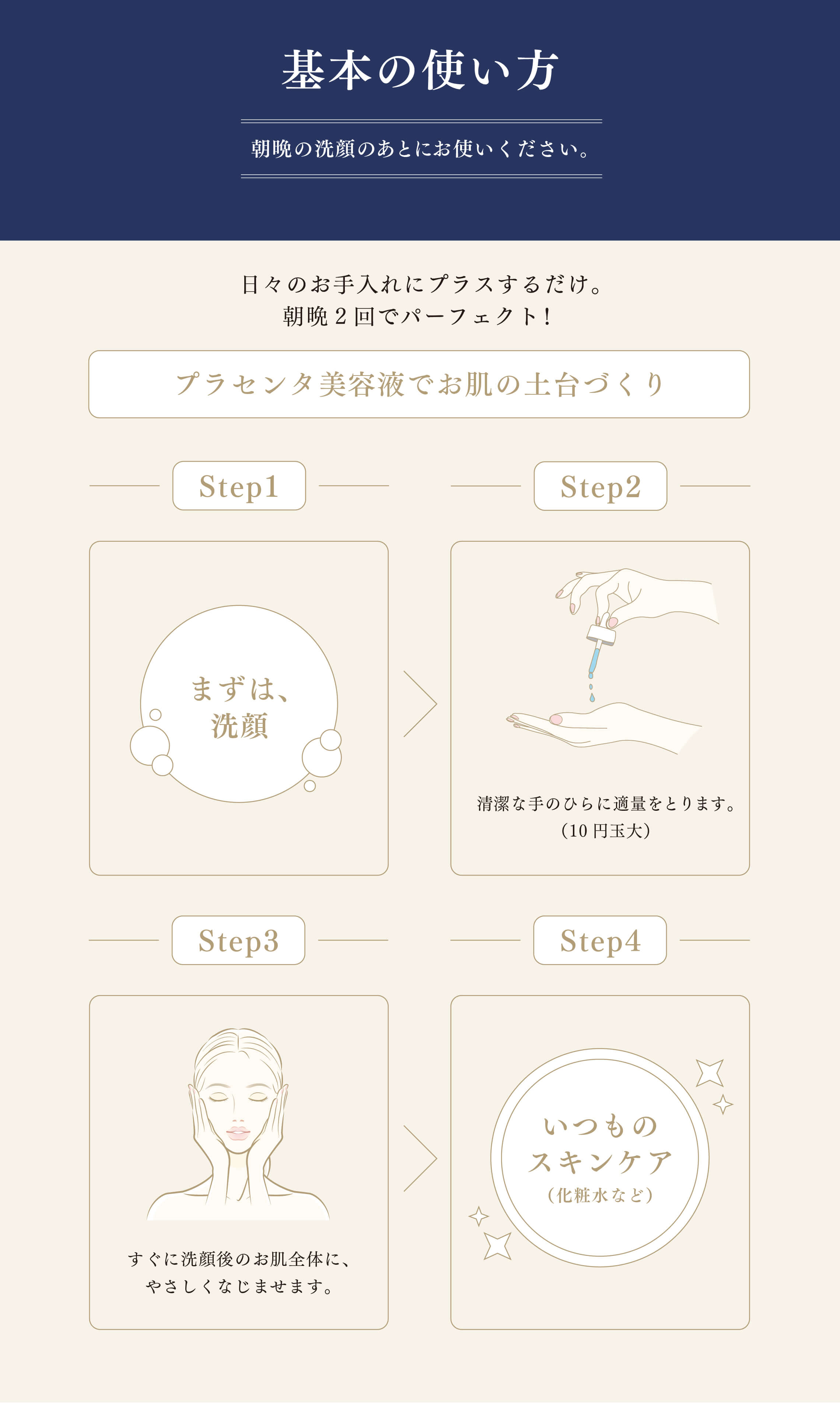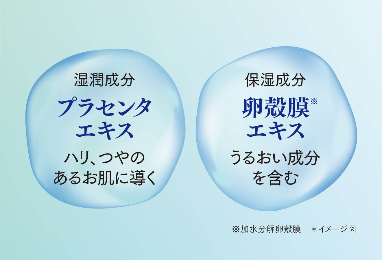 有効成分のナイアシンアミドとプラセンタエキス(湿潤成分)、卵殻膜エキス(保湿成分)を配合した、女性の肌悩みに応える導入美容液です。