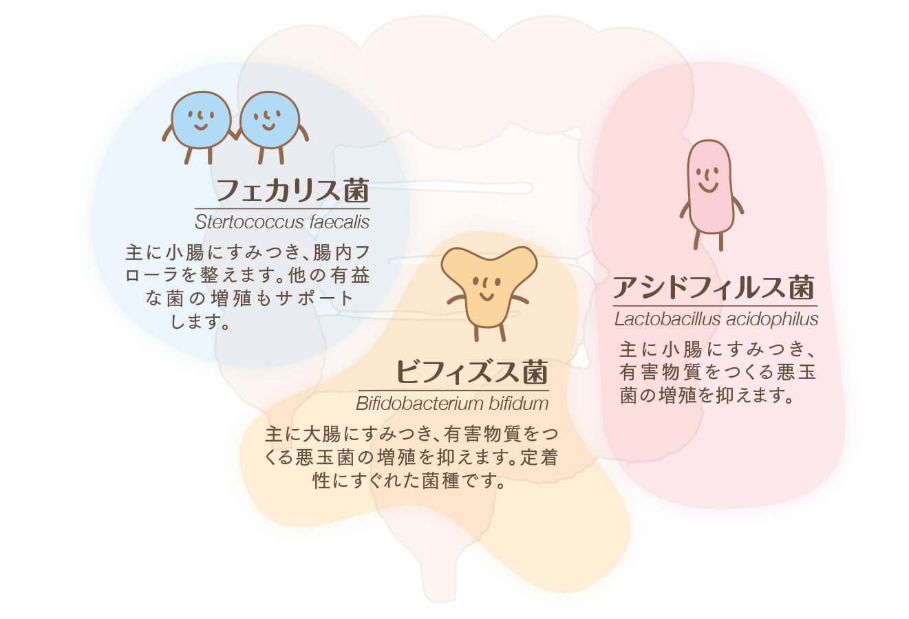 小腸にすみつく2種の乳酸菌(フェカリス菌、アシドフィルス菌)と大腸にすみつくビフィズス菌が、生きたまま腸まで届き、小腸から大腸まで幅広く腸内環境を整えます。