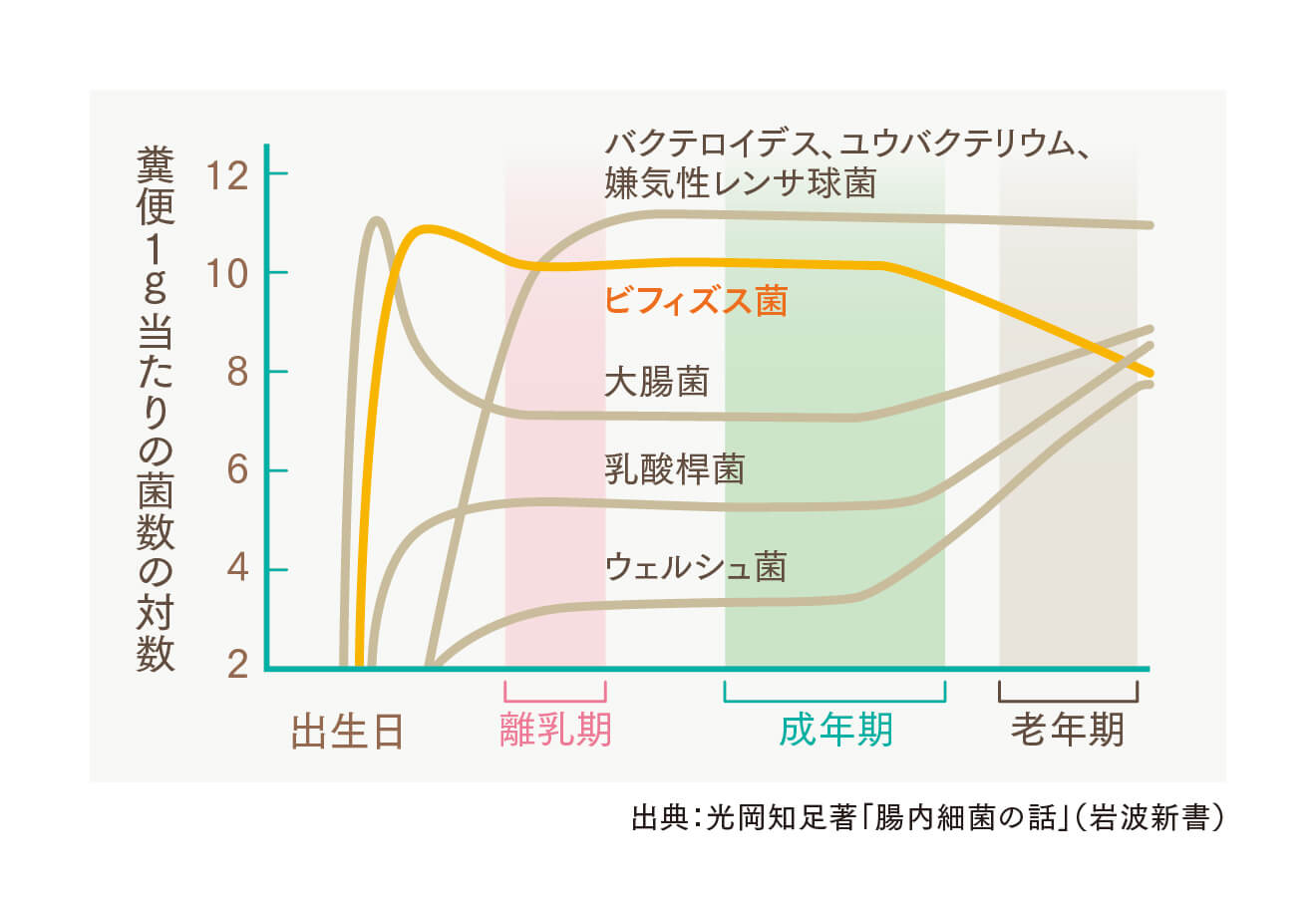 加齢とともに善玉菌が減少し、悪玉菌が増加する傾向があります。善玉菌であるビフィズス菌は赤ちゃんのときが一番多く、また長寿の人にも多いという研究もあります。