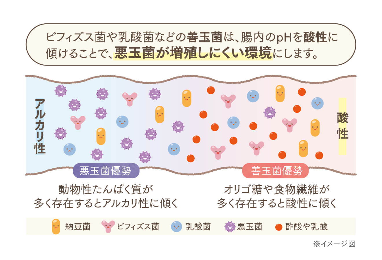腸内は、善玉菌、悪玉菌のどちらかが減るとどちらかが増え、そのバランスによって、酸性かアルカリ性に傾きます。ビフィズス菌や乳酸菌などは、発酵作用により糖を分解して酢酸や乳酸を作り出し、これにより腸内を酸性に保つはたらきをします。